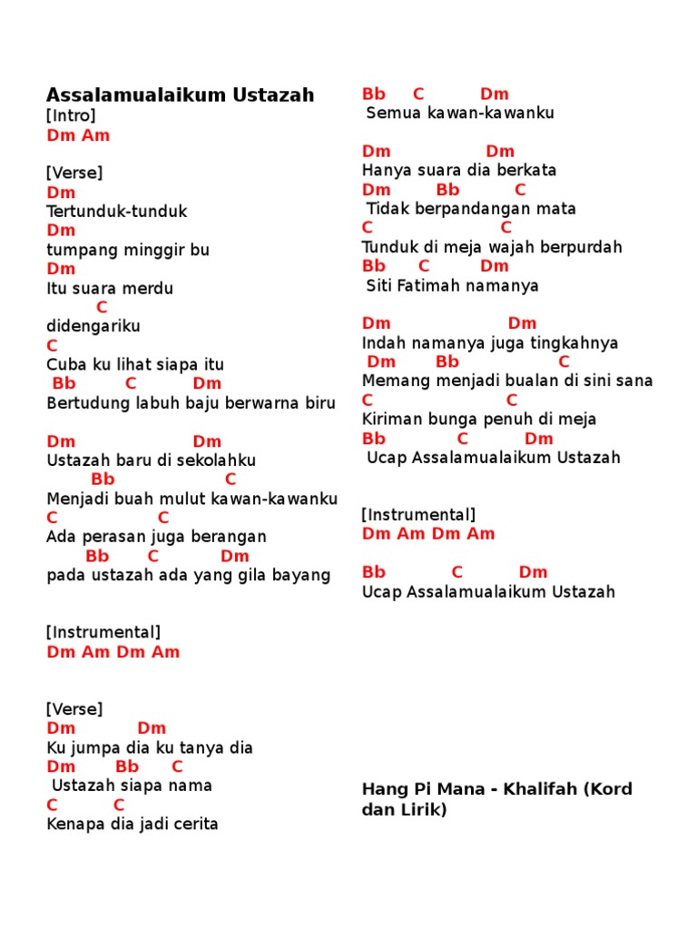 Kord Gitar Assalamualaikum Ustazah Khalifah Dm Am Dm Tertunduk-tunduk Dm tumpang minggir bu Dm Itu suara merdu C didengariku C Cuba. Author suhail69 a 55. Lirik Lagu Assalamualaikum Ustazah.